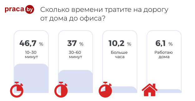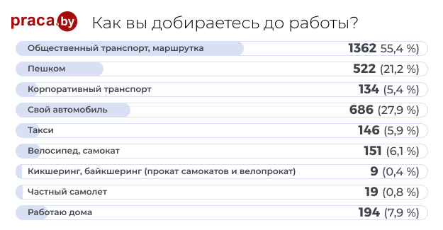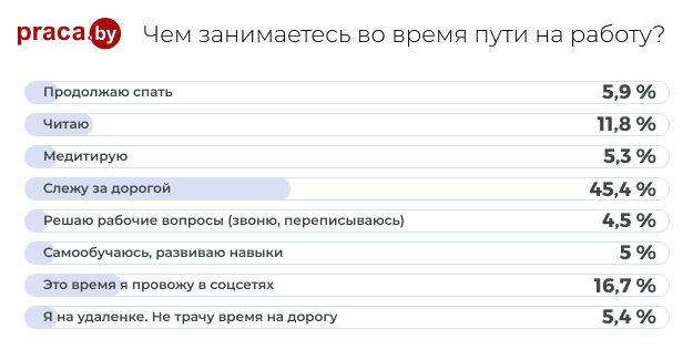 В период с 6 по 13 июня 2022 г. мы проводили исследование с целью узнать у пользователей Praca.by, как они добираются на работу, сколько это занимает времени, какое время они считают оптимальным и чем занимаются в пути. Методом исследования был выбран опрос, участие в котором приняли 2460 человек. Мы задали разные вопросы (не только для того, чтобы узнать, как используют респонденты время в дороге, хотя, безусловно, это самый важный вопрос), поскольку ежедневная дорога до работы и обратно сулит множество отрицательных последствий для здоровья, особенно если она продолжительная. Кто-то скажет, что с пробками и толчеей в транспорте ничего не поделать, и будет прав, но только наполовину. Потому что многое зависит от нас самих, от того, как мы мысленно спланируем путь на работу. И я не только о маршруте (ведь где-то можно пройтись пешком или прокатиться на велосипеде), а о том, чем мы будем заниматься в пути. Такой психологический настрой (если хотите, дорожный план) заметно уменьшает влияние отрицательных последствий.