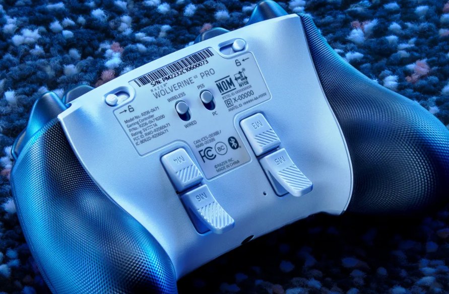 В задней части Wolverine V2 Pro вы найдете четыре программируемых задних лепестка, "спусковые" муфты и переключатели для переключения между беспроводным и проводным режимами для каждой платформы.
