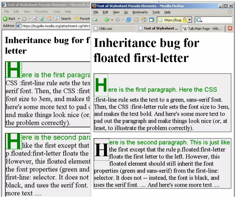 Неправильное поведение — согласно стандарту CSS — «не позволяет авторам позиционировать первую букву, уменьшая поле строки за счет использования небольшой высоты строки». Конечным результатом было то, что Firefox неправильно отображал первую букву, в то время как другие браузеры (Opera 7.5+ и Safari 1.0 в то время) функцию CSS обрабатывали правильно.