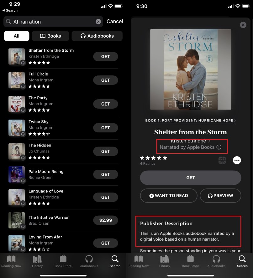Как отмечает The Guardian, вы можете найти эти книги в Apple Books, выполнив поиск по запросу «рассказ ИИ». В описании издателя будет сказано: «Это аудиокнига Apple Books, озвученная цифровым голосом, основанном на человеческом рассказчике».