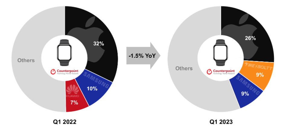 Даже поставки Huawei в Китае сократились на 15% в первом квартале 2023 года, но благодаря увеличению поставок в такие регионы, как Латинская Америка, Ближний Восток и Африка и Индия, компания потеряла лишь 9% доли поставок в мире. Однако этого было недостаточно для того, чтобы Huawei не вытеснили с мировой пьедестала умных часов.