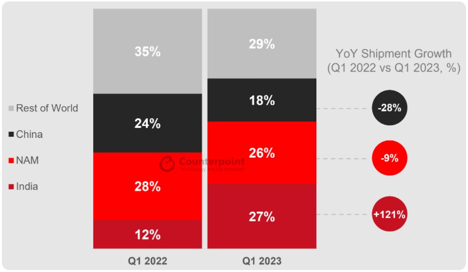Глядя на долю поставок умных часов по регионам, становится яснее, почему Fire-Boltt опередил Samsung. Рынок умных часов в Китае, Северной Америке и остальном мире сократился в первом квартале 2023 года, в то время как поставки умных часов в Индии выросли с 12% в первом квартале 2022 года до 27% в первом квартале 2023 года. Доминировал местный бренд Fire-Boltt.