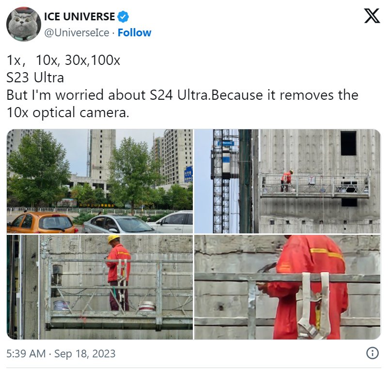 Пока неясно, будет ли для нее предложена адекватная замена и вообще произойдет ли это на самом деле, но зачастую вполне надежный инсайдер Ice Universe уже несколько раз указывал на то, что Samsung, видимо, хочет скрыть от Galaxy S24 Ultra очень важную особенность трех последних флагманов Galaxy S: телеобъектив с 10-кратным увеличением.