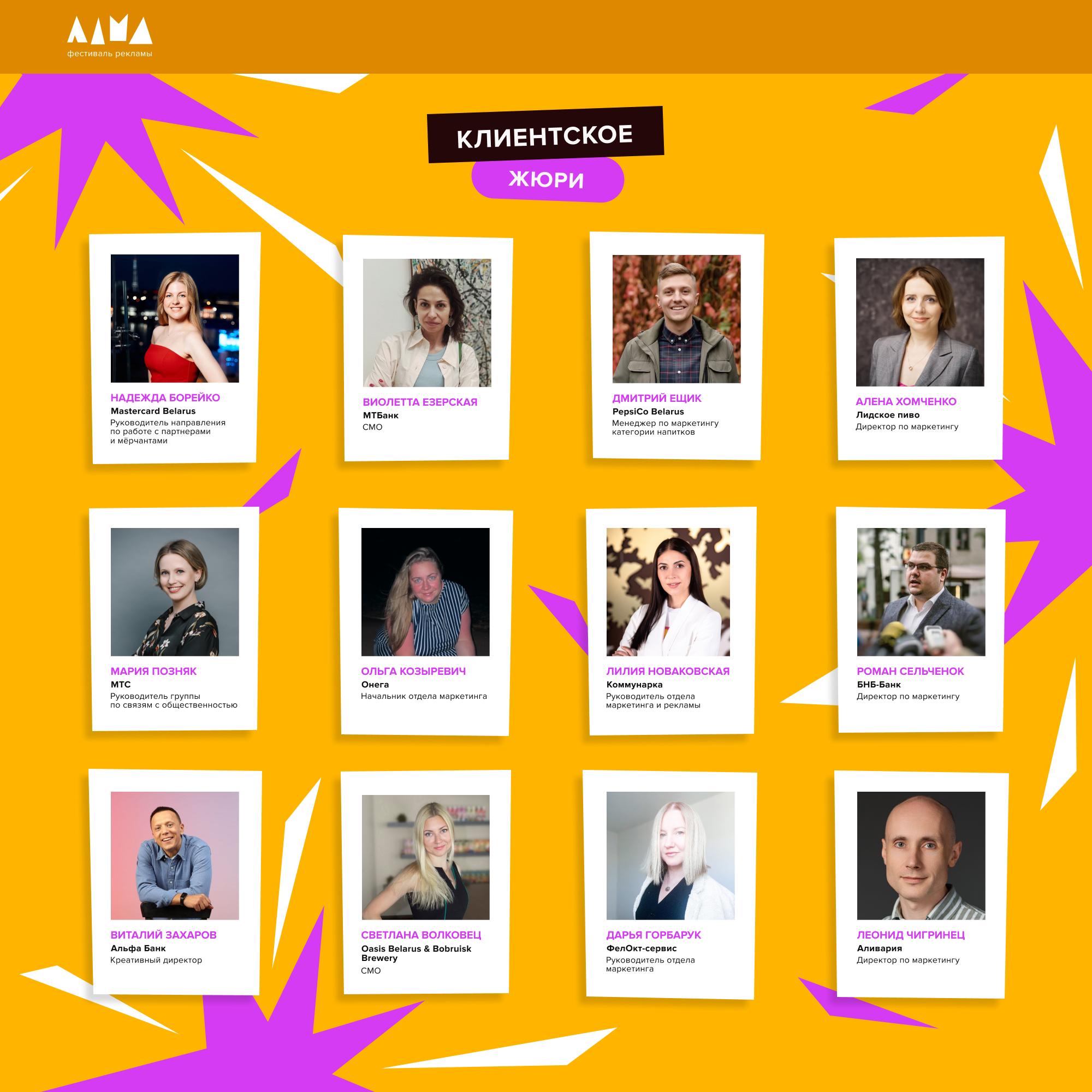 В клиентский состав жюри войдут представители международных и локальных брендов, чьи рекламные кампании наиболее активно и креативно представлены на белорусском рынке. Председатель этого состава жюри – Надежда Борейко, руководитель направления по работе с партнерами и мерчантами Mastercard Belarus, международная платежная система, которая выступает генеральным партнером события. Как глобальная финансовая и технологическая компания Mastercard не только помогает развивать цифровую экономику, но и выстраивает долгосрочные партнерские отношения на рынке.
