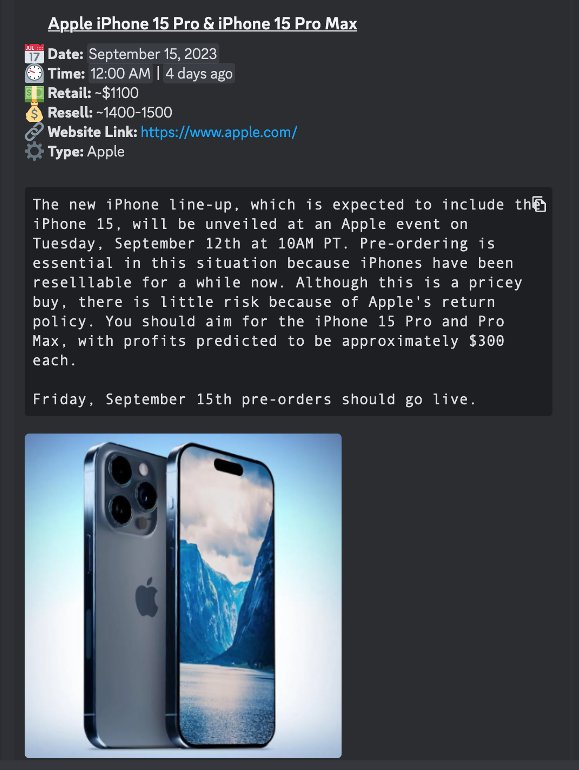Не объясняется, почему на скриншоте изображен автоматизированный бот, а не человек, рекомендующий скальперам купить iPhone 15. Но ясно, что даже такая дорогая покупка может оказаться беспроигрышной ставкой.