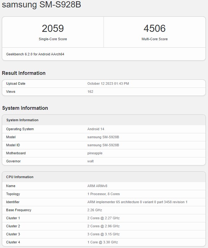 Ключевой вывод заключается в том, что Samsung Galaxy S24 Ultra действительно будет использовать исключительно чип Snapdragon 8 Gen 3, поскольку, как сообщается, одно устройство предназначено для США, а другое — для всего мира. Другой интересный факт: частота основного ядра увеличена только до 3,30 ГГц, что выше, чем 3,21 ГГц, которые мы видели у Exynos 2400, но ниже, чем 3,36 ГГц внутри Galaxy S23 Ultra.