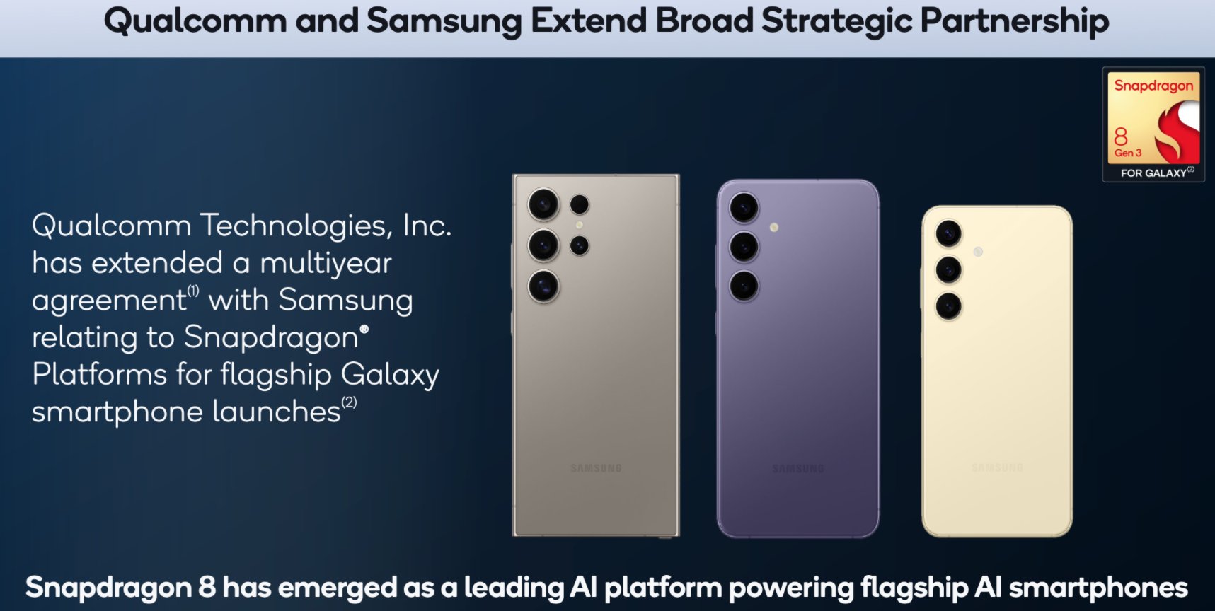 Недавний дебют Samsung серии Galaxy S24 с процессором Snapdragon 8 Gen 3 в США и на других рынках является хорошим примером возможностей чипсета, поскольку эта серия полна функций и инструментов на базе искусственного интеллекта. Учитывая это, неудивительно, что партнерство Qualcomm Snapdragon с Samsung продолжится, ознаменовавшись расширенным многолетним соглашением относительно платформ Snapdragon для флагманских выпусков смартфонов Galaxy.