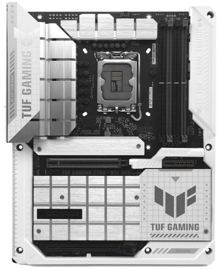 Теперь к более интересным моментам... TUF GAMING Z790-BTF WIFI отличается расположением встроенных разъемов, поскольку все разъемы питания, такие как 8-контактный ATX и 24-контактный материнская плата, расположены сзади. Благодаря такому подходу кабели спереди не будут видны, что обеспечивает аккуратный и профессиональный вид.