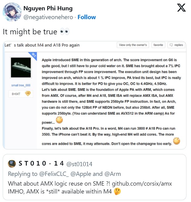 Информатор под ником @negativeonehero также сообщил, что M4 поддерживает SME или Scalable Matrix Extension. В ветке типстера идет дискуссия о том, действительно ли SME выиграл от M4 в одноядерных и многоядерных тестах производительности Geekbench 6.