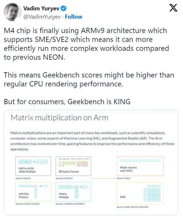 Преимущество многоядерных процессоров на 45 процентов по сравнению с M2, повышение частоты производительных ядер до 4,40 ГГц и увеличение общего количества ядер ЦП — не единственное изменение, которое Apple пришлось реализовать, чтобы достичь нового результата в Geekbench 6. Согласно YouTuber Вадим Юрьев, M4 теперь выполнен с использованием набора инструкций ARMv9, который превосходит NEON и позволяет чипсету эффективно выполнять сложные рабочие нагрузки.
