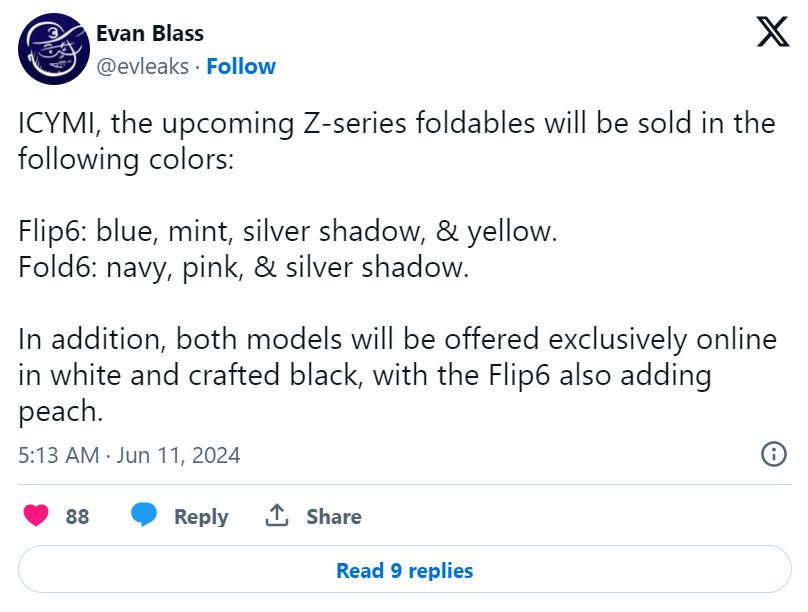 С другой стороны, Galaxy Z Flip 6, как сообщается, будет доступен в синем, мятном, серебристом и желтом цветах, а также в цветах White и Crafted Black, доступных только онлайн, а также в новом персиковом цвете. Никаких изображений, сопровождающих эту конкретную утечку, нет, поэтому мы пока относимся к ней с недоверием. Тем не менее, послужной список источника утечек информации о смартфонах безупречен, и нам не придется долго ждать, чтобы узнать, подтвердится ли это открытие.
