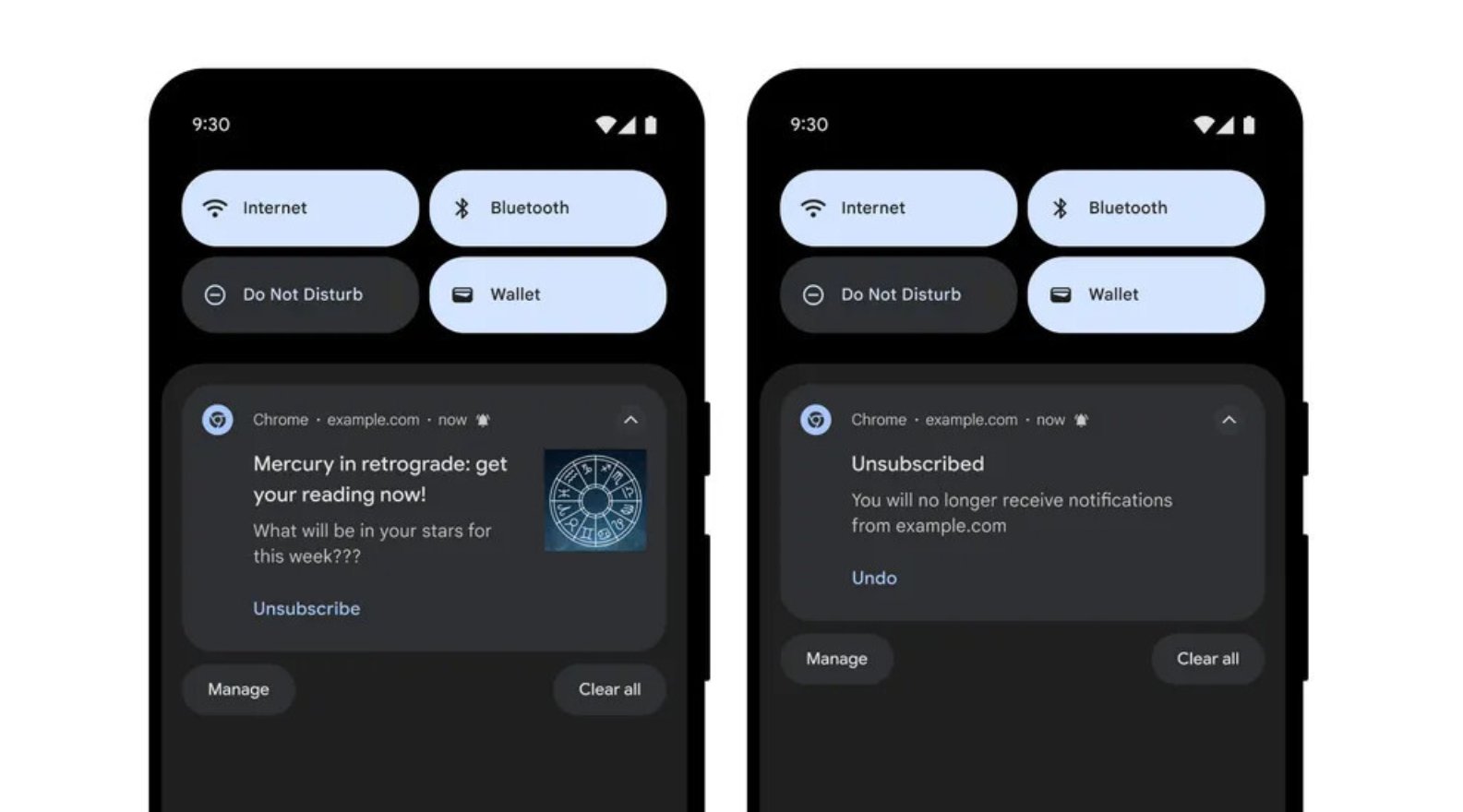 Далее, Google заявляет, что это упростит отказ от уведомлений веб-сайтов. Теперь пользователи будут видеть кнопку отмены подписки под уведомлениями, чтобы они могли нажать ее, если не хотят продолжать их получать. Сначала эта функция появится на устройствах Pixel, но вскоре станет доступна и на других телефонах Android. На поддерживаемых устройствах эта функция привела к сокращению объема уведомлений на 30%.