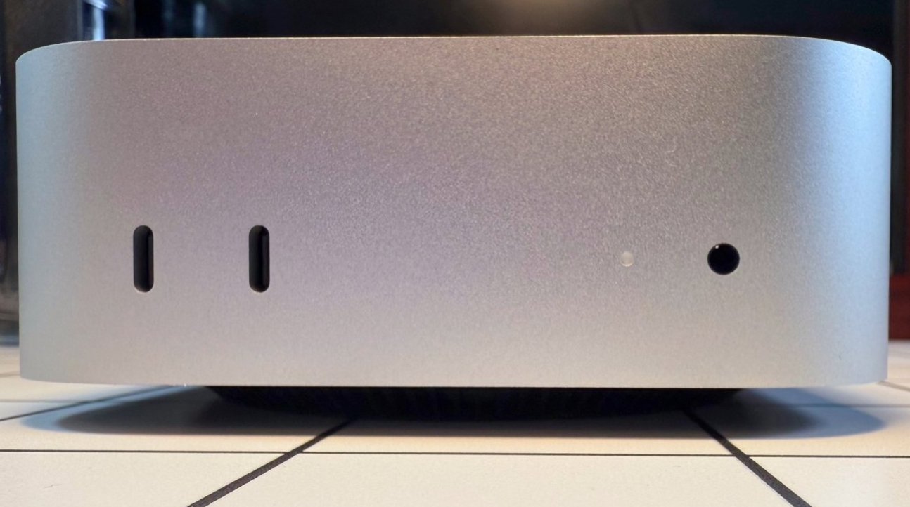 Другие респонденты жаловались на то, что у них были похожие проблемы при использовании док-станций, подключенных через USB 3, а также на то, что переключатель KVM не работал после выхода Mac mini из спящего режима. После физического отключения и повторного подключения все заработало нормально. Другой сказал, что проблема была только с задними портами, так как зависания не проявлялись при использовании передних портов. В сообщении от конца декабря также спрашивалось, были ли у пользователей проблемы с питанием устройств USB-C, работающих от M4 Mac mini. Внешний жесткий диск, подключенный через USB-C, отключался при выполнении задачи «I/O heavy», даже при прямом подключении. Были упомянуты проблемы с концентраторами, которые не работали с портами, но продолжали работать в других местах. Были подняты вопросы о потреблении энергии подключенными устройствами, а также о том, была ли это проблема с передним или задним USB, хотя, похоже, она не ограничивается задним набором. Серебристый компьютер с закругленными краями на плиточной поверхности, с портами и кнопками на передней панели.