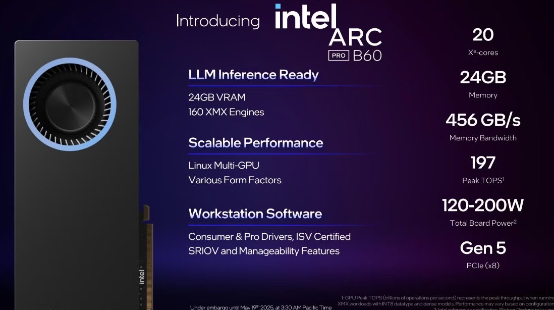 Точнее, Intel приоткрыла завесу тайны над двумя новыми GPU в линейке Arc Pro — Arc B50 и B60. Обе являются картами для рабочих станций с фокусом на ИИ и используют ту же архитектуру Battlemage, которую мы уже видели на всем, от ноутбуков Lunar Lake до Arc B580. Фактически, B50 и B60 используют тот же кристалл BMG-G21, что и Arc B580, хотя и с огромным увеличением емкости VRAM для удовлетворения требовательных рабочих нагрузок ИИ.