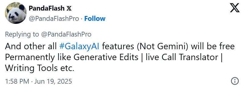Однако будущих поклонников складных устройств может ждать нечто более захватывающее. Надежный источник утечек PandaFlashPro on X намекнул, что вы можете получить все функции Galaxy AI бесплатно на всю жизнь с предстоящими Galaxy Z Flip7 и Galaxy Z Fold7. В частности, как сообщается, Galaxy AI также будет постоянно бесплатным на доступном Galaxy Z Flip7 FE.