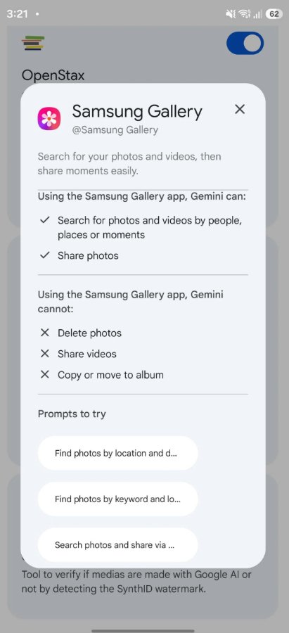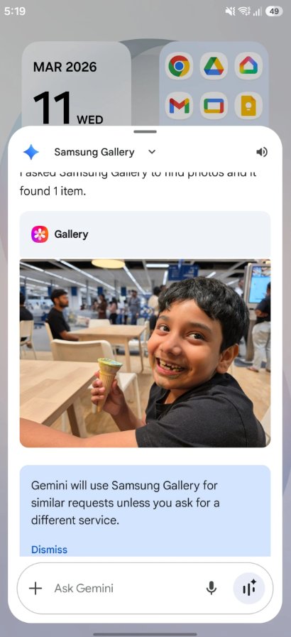 Это позволяет искать фотографии и видео в галерее с помощью Gemini. Например, вы можете сказать: «Найдите фотографии меня с моей собакой этим летом», и Gemini покажет все соответствующие фотографии из приложения «Галерея» на вашем телефоне Galaxy.