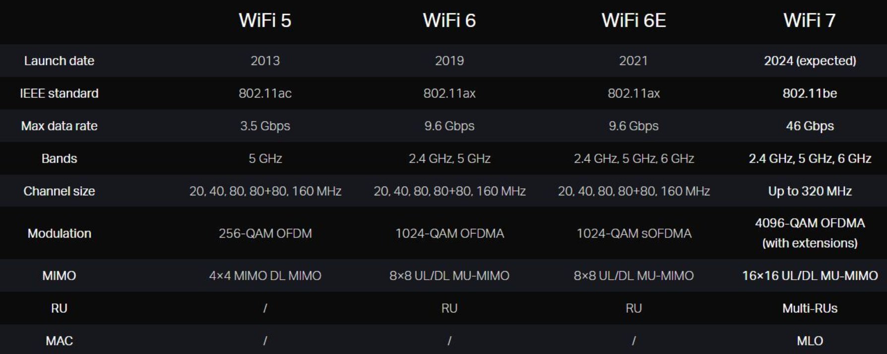 Нам нужна все более высокая скорость передачи данных, поскольку наши файлы становятся все больше и больше. Wi-Fi 7 использует три частоты: 2,4 ГГц, 5 ГГц и 6 ГГц, а также использует больший размер канала и модуляцию, обеспечивая скорость до 96 Gps. Подробные различия вы можете увидеть в таблице ниже.